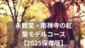 紅葉ピークは 11月下旬〜12月中旬 見込み。朝は人流が緩く、石畳や路地の撮影効率が高いです。